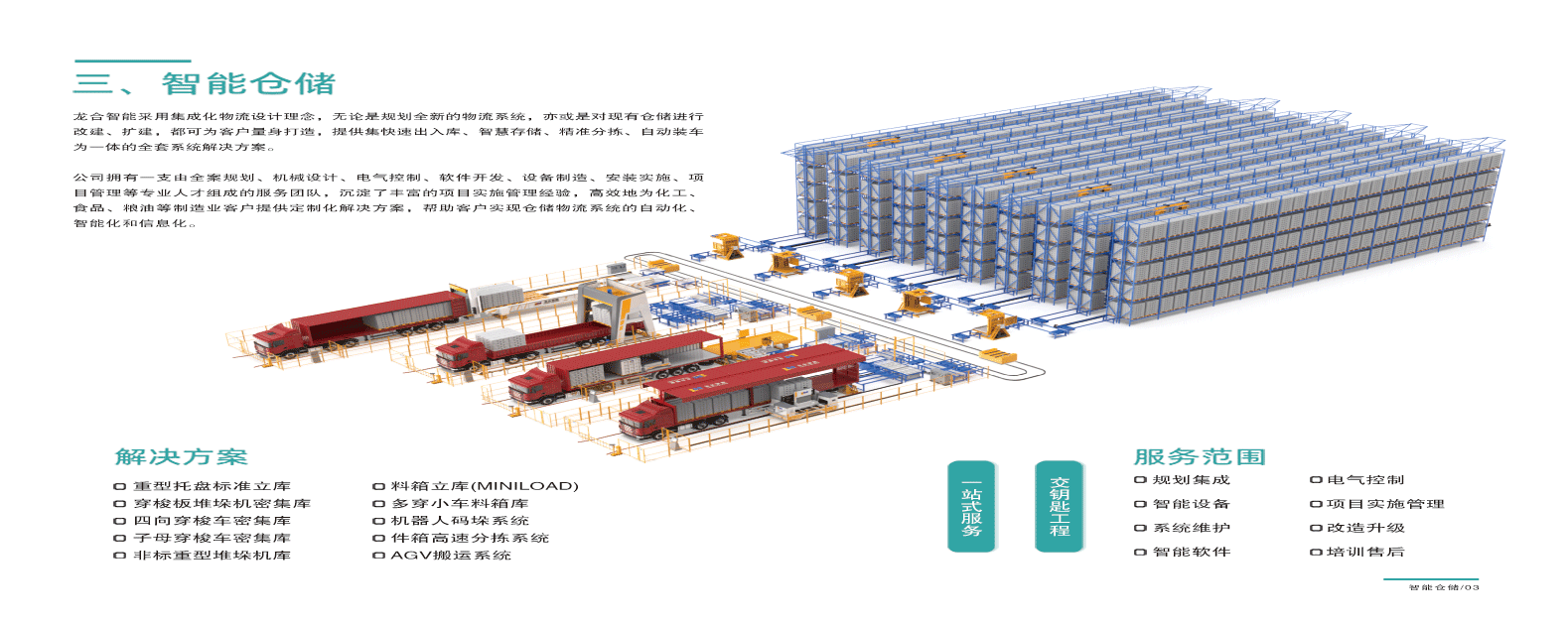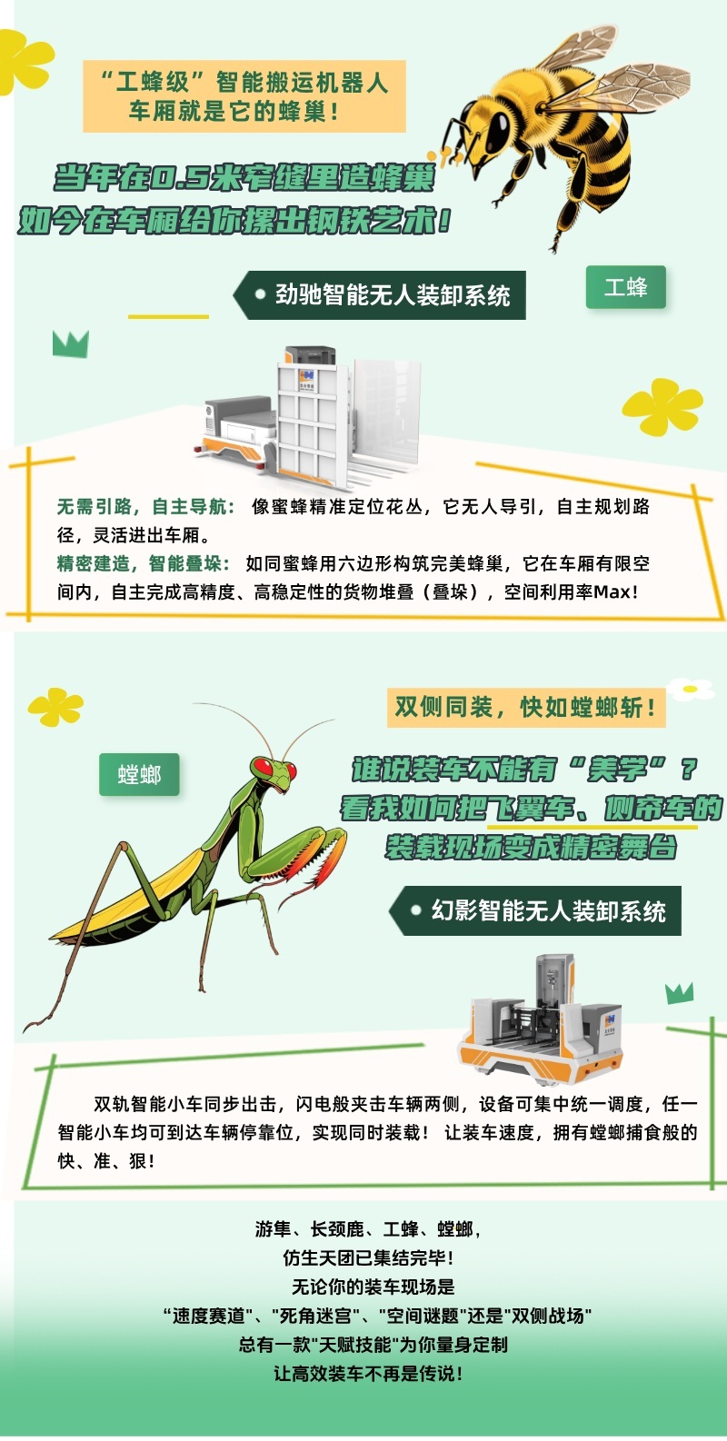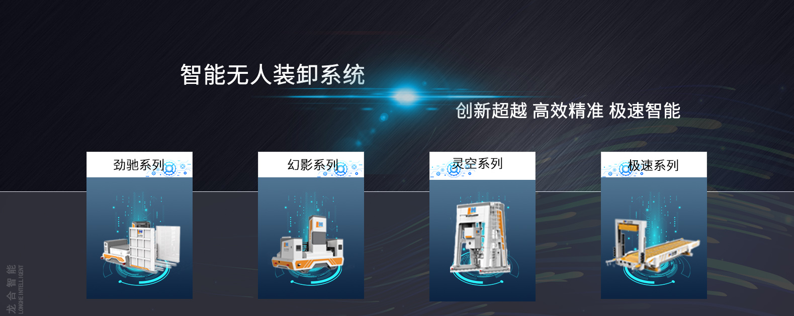 幻影/靈空/極速/勁馳四大產品線:全面覆蓋國內公路運輸所有車型,包括后裝式集裝箱車、飛翼式集裝箱車、卷簾車、邊欄板可拆放及不可拆放平板車等終端物料發貨裝車,裝車過程實現自動化、智能化操作,20分鐘內完成30噸貨物裝車,產品填補國內終端物料智能無人裝車空白,可完全替代國外進口產品,獲評省內首臺(套)重大技術裝備4項、省級重點新產品9項。
